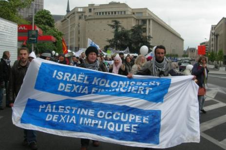 Ce mercredi 12 mai 2010 quelques 150 participants ont protesté devant le siège social, contre les crédits que la banque Franco-Belge Dexia accorde aux colonies israéliennes en territoires palestiniens occupés. (toutes ces colonies sont illégales). Parallèlement à l’assemblée une vingtaine d’actionnaires ont cuisiné le président Jean-Luc Dehaene sur la politique de Dexia en Israël.