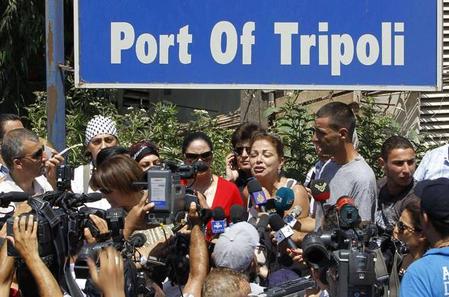 Photo : L’organisatrice de la « flottille des femmes », Samar al-Hajj, annonce à la presse le départ prochain du Mariam, qui doit briser le blocus israélien de la bande Gaza, dans le port de Tripoli, au Liban, le 19 août 2010. Hussein Malla/AP/SIPA