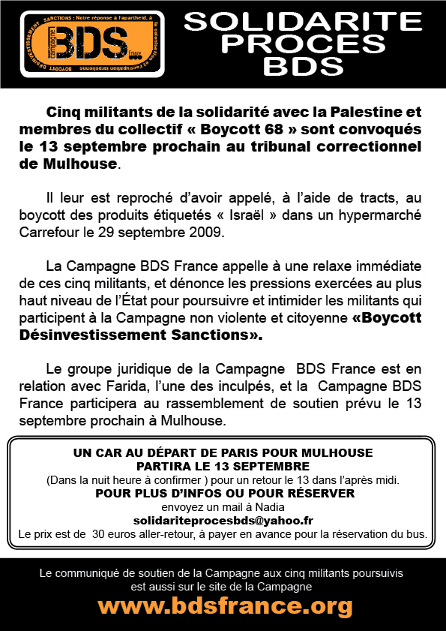 J’apprends que cinq militants du Collectif Boycott 68 sont convoqués devant le Tribunal correctionnel de Mulhouse. Je constate qu’aucun acte de violence, de dégradation ou de pression sur les personnes relatif à l’action du 26 septembre 2009, n’a été signalé.