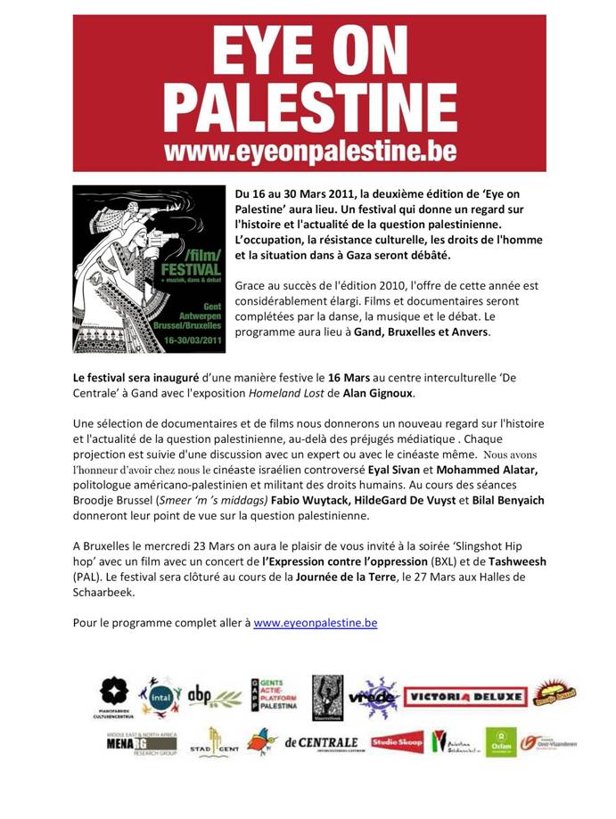 11.11.11 – Koepel van de Vlaamse Noord Zuid-Beweging, Aardewerk, ABP, ACW, Artsen voor Vrede, AWSA, BOEH!, Broederlijk Delen, BRussells tribunal, CETRI – Centre Tricontinental, CNCD – 11.11.11, CNAPD, Comité de Vigilance pour la Démocratie en Tunisie, Culturencentrum Pianofabriek, EcoloJ, Egalité, fos- Socialistische Solidariteit, Greenpeace, intal, Jeunes anticapitalistes – Jongeren antikapitalisten, Käthe Kollwitz Vredesloop, Kif Kif, Links Ecologisch Forum, Linkse Socialistische Partij / Parti Socialiste de Lutte (LSP-PSL), MCP, Mensen zonder Papieren, MIR-IRG, Mouvement Ouvrier Chrétien (MOC), PVDA/PTB, RCN Justice et démocratie, SAP-LCR, SCI-Projets internationaux, Solidariteitsgroep met de Egyptische, Tourisme autrement, Tunesische en Libische revoluties en de volkeren in beweging, Vaka/Hand in Hand vzw, Vonk/Unité Socialiste, Vrede vzw, Vredeshuis Aalst, Vrouwen Overleg Komitee, Wereldsolidariteit/Solidarité Mondiale