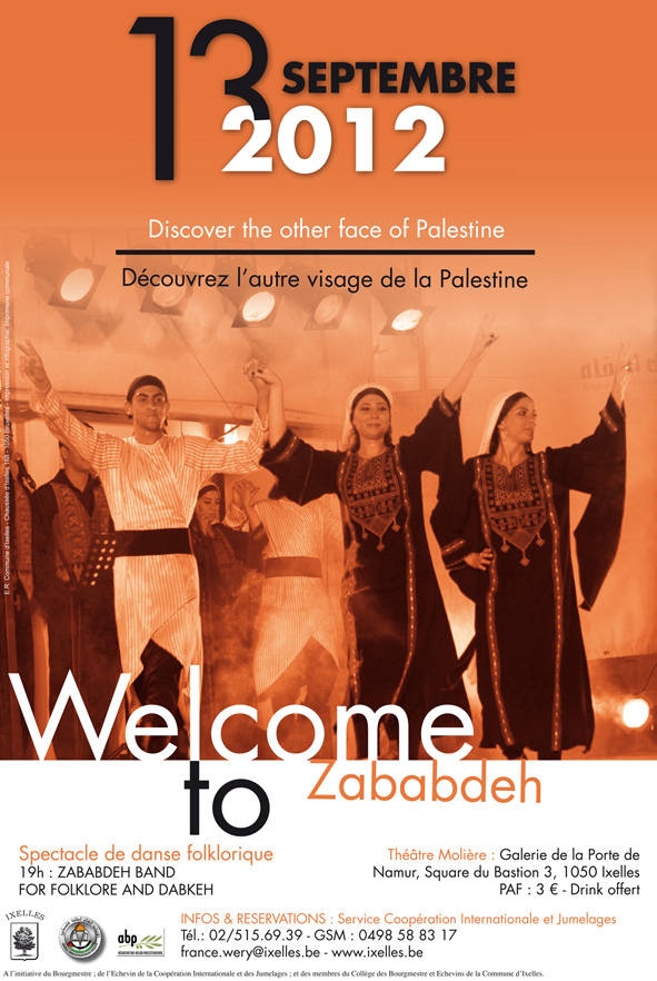 Le Zababdeh Band for Folklore and Dabkeh donnera une représentation au théâtre Molière/Bruxelles le 13 septembre dans le cadre d’une performance organisée par la Commune d’Ixelles, L’Union Générale Des Etudiants De Palestine (GUPS) et l’Association Belgo-Palestinienne (ABP) afin de mettre à l’honneur la culture palestinienne.