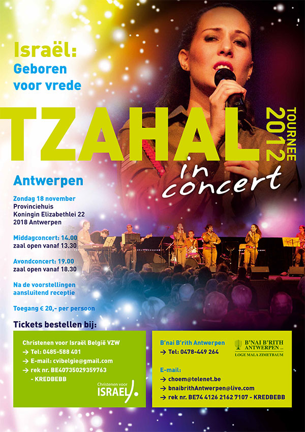 Christenen voor Israel en B’nai B’rith Antwerpen organiseren dit jaar opnieuw een concert met de band van Tzahal, het Israëlische leger. Gastsprekers voor de show zijn voormalig premier Yves Leterme (CD&V) en minister van werk Monica De Coninck (sp.a).