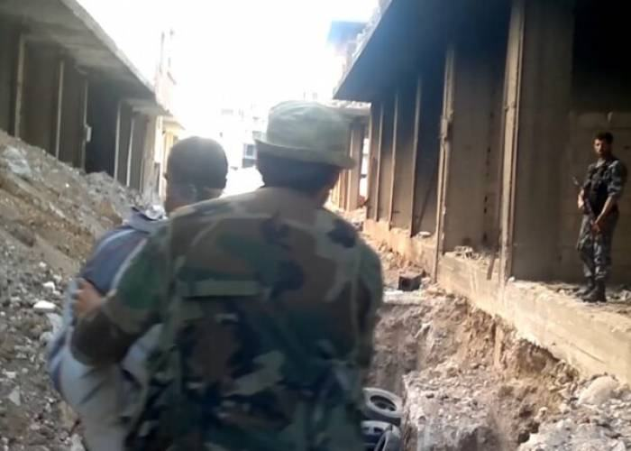 Le mode opératoire des exécutions est bien rodé. Les prisonniers arrivaient en minibus au quartier Tadamone depuis les centres de détention. Ils avaient tous les yeux bandés, ils étaient amenés au lieu d’exécution puis jetés un à un dans un trou creusé en plein milieu des rues étroites où les agents du régime avaient préalablement déposé des pneus. Les pneus servaient à alimenter le brasier, une fois tous les prisonniers exécutés les miliciens aspergeaient la montagne de cadavres d’essence. Puis la fosse était recouverte. Sur la photo ci-dessous extraite des vidéos on peut apercevoir une des victimes menées à la mort par Amjd qu’on reconnait à son chapeau de pêcheur. Au 2eme plan on aperçoit une fosse, les pneus et un des agents du régime qui attend kalash à la main. Il s’agit là d’une fosse commune en plein milieu d’une zone résidentielle, non loin de la ligne de front.